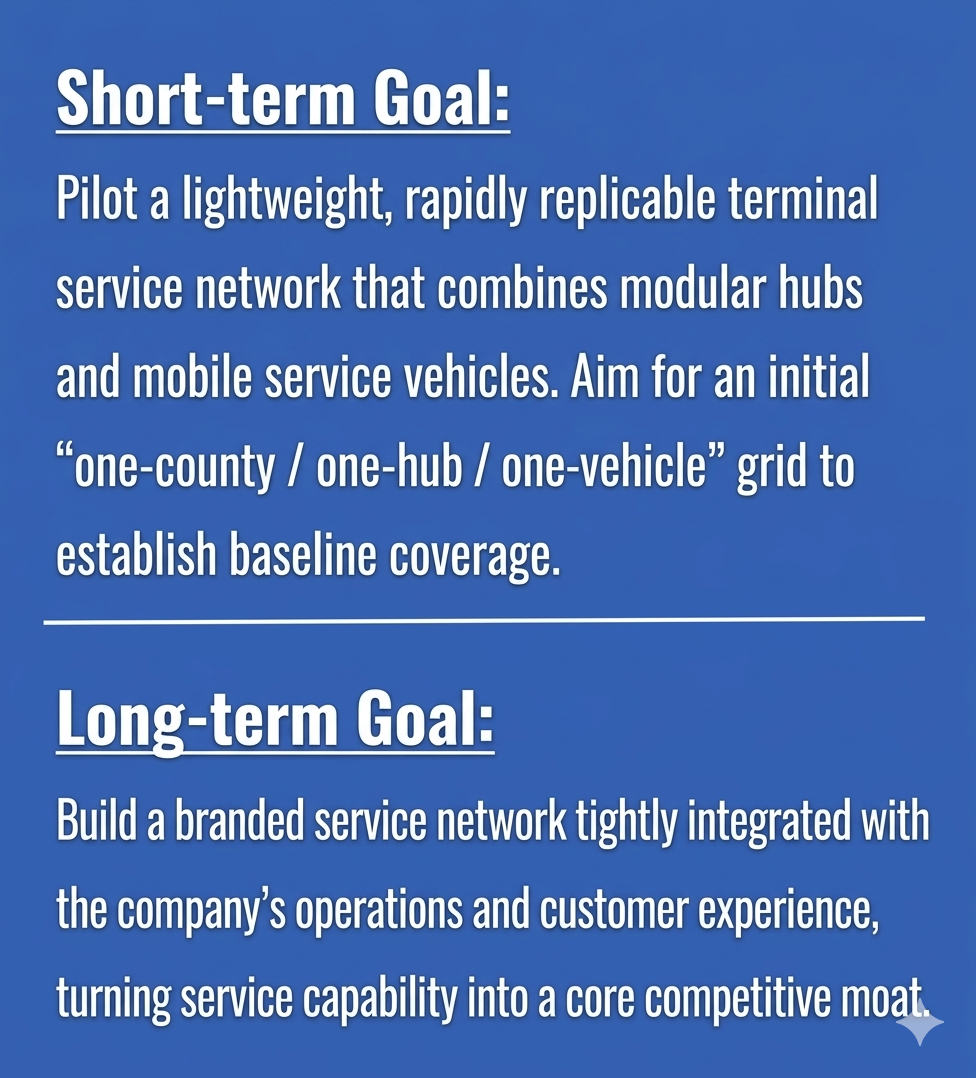 We support automotive manufacturers in building their own branded service ecosystems and expanding service coverage closer to customers.Help OEMs establish proprietary service systems and operational networksExtend service networks to county and township-level marketsProvide supporting services for EV infrastructure such as battery swap stationsAssist major automotive groups in building their own service brands and nationwide service networks