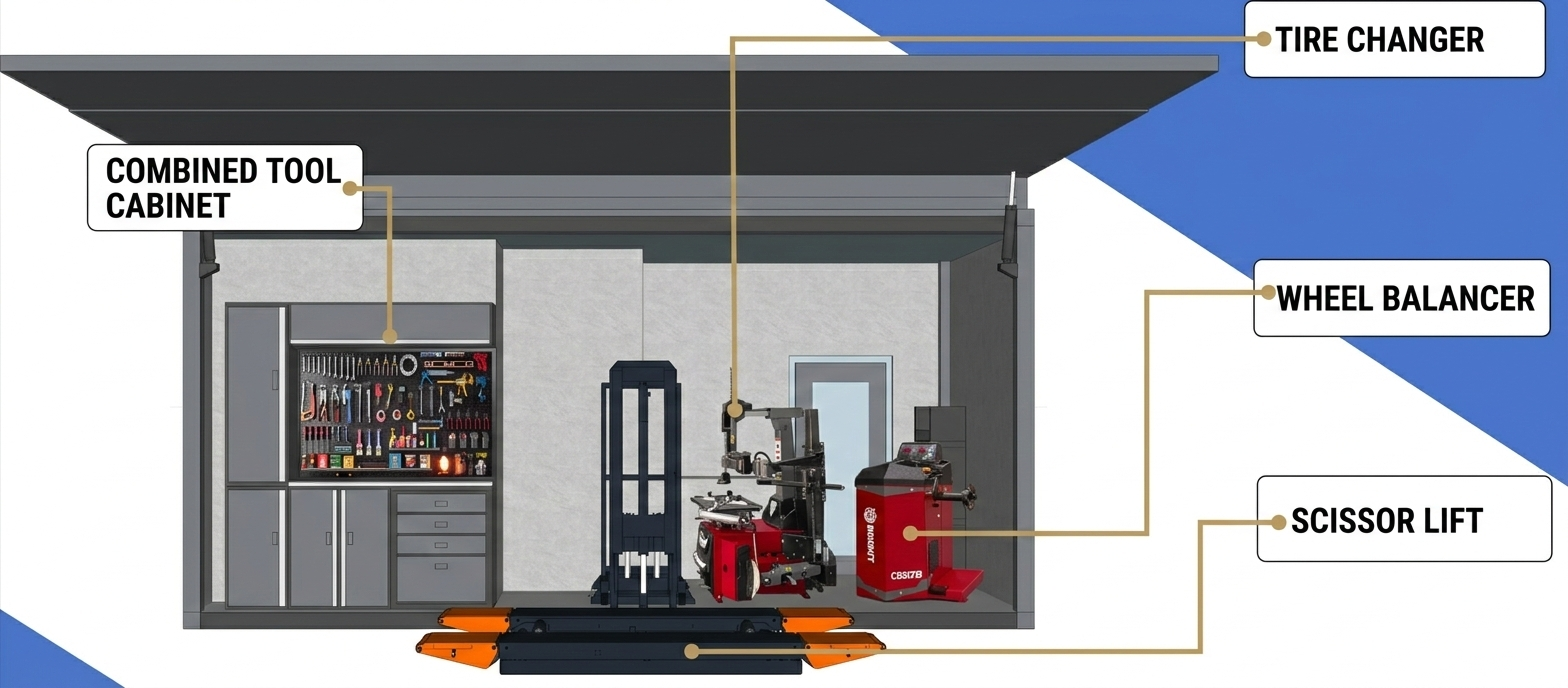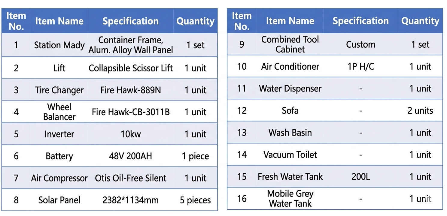 Space Integration • Occupies three parking spaces• Auto repair area: 24 m² • Tire service area: 10 m² • Customer lounge: 5 m²(Split-type air conditioning, vacuum toilet)