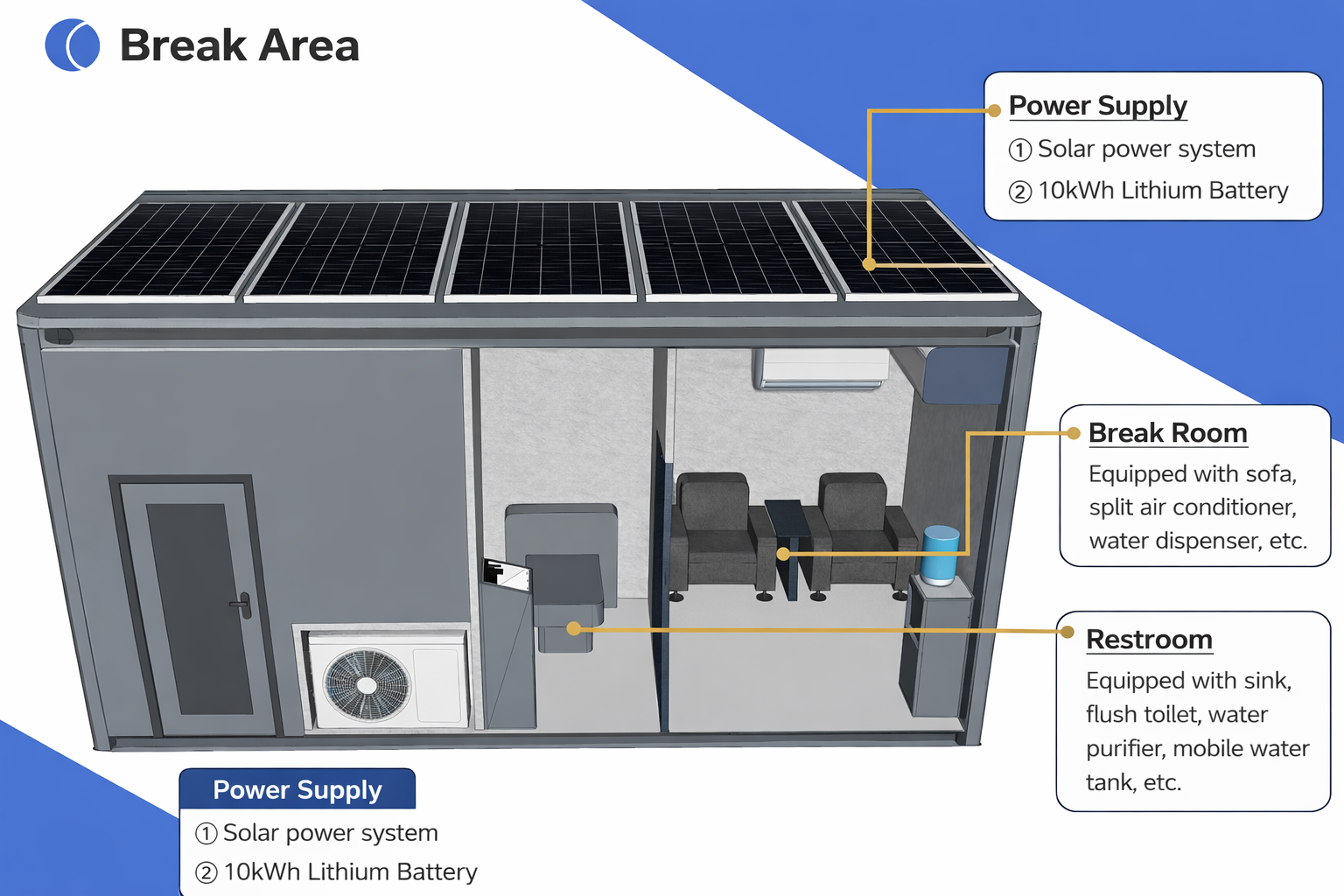Rapid Deployment • Setup and removal completed in four steps • Total time required: less than 30 minutes Self-Sufficient Utilities • Solar power generation system • 10 kWh lithium battery storage • 10 kW inverter • 200L clean water tank • Mobile wastewater tank